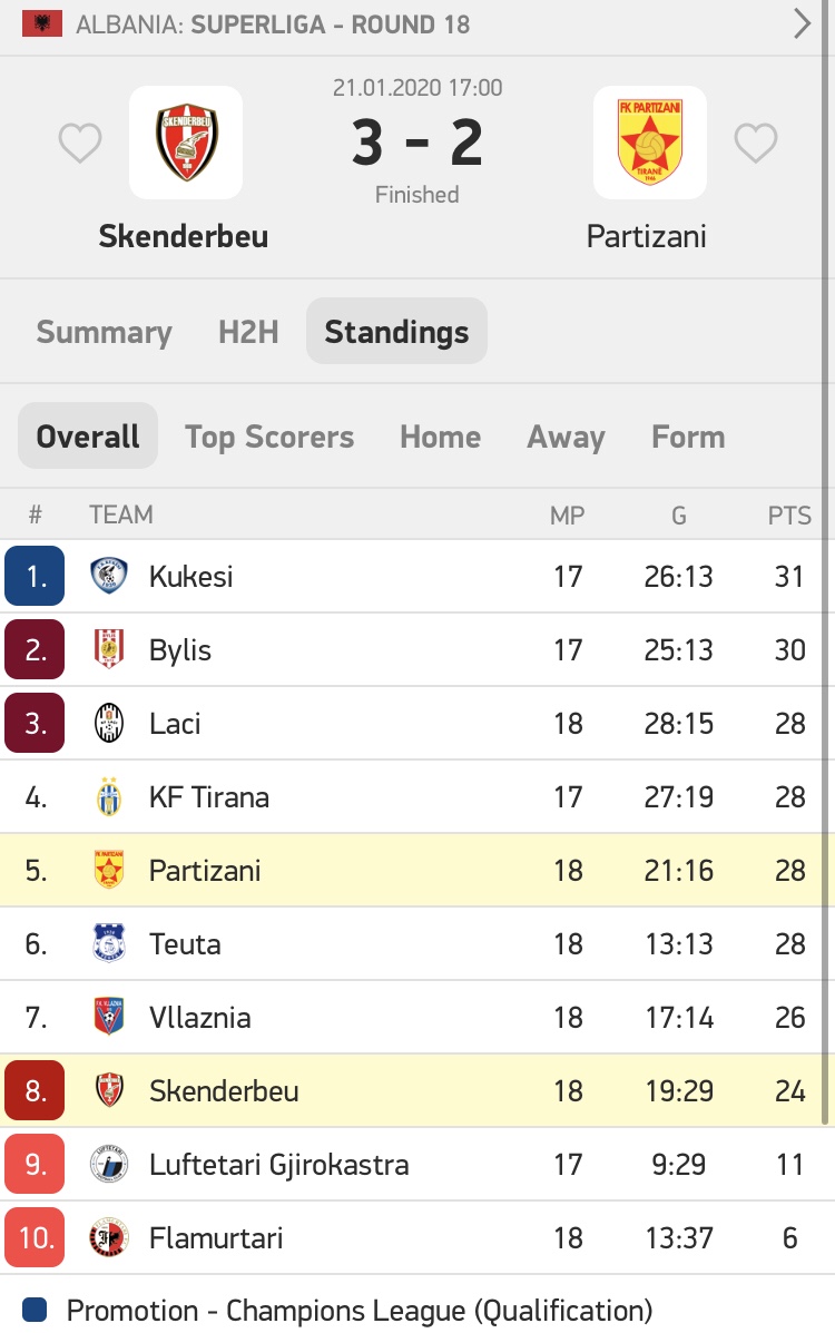 Aktualisht Skenderbeu renditet i 8 ,në kuotën e 24 pikëve,4 pikë larg vëndit te tretë.