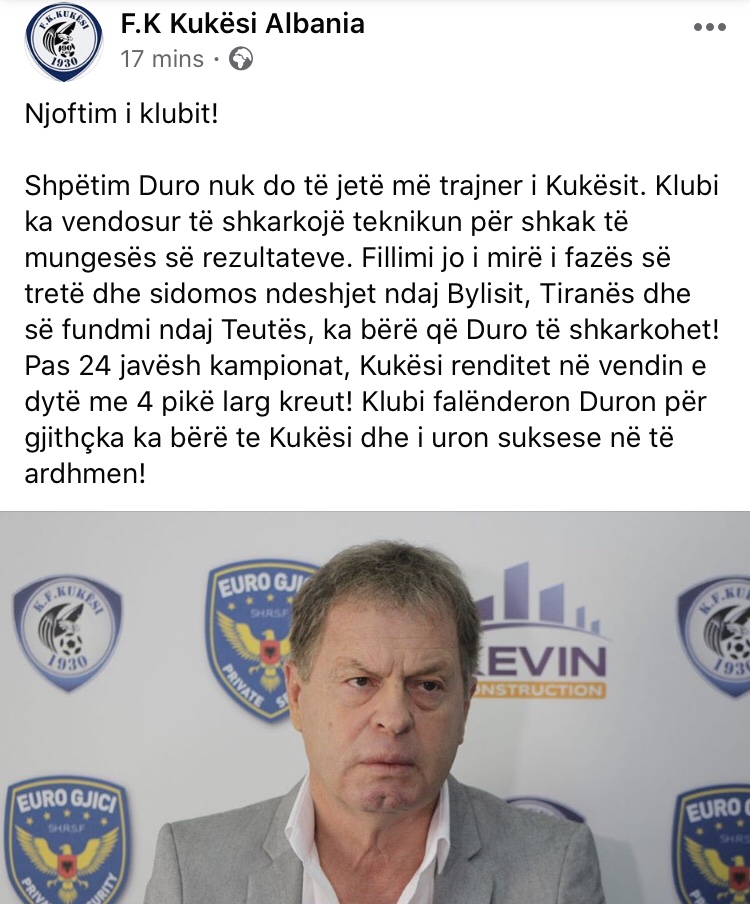 Shpëtim Duro nuk do të jetë më trajner i Kukësit. Klubi ka vendosur të shkarkojë teknikun për shkak të mungesës së rezultateve. Fillimi jo i mirë i fazës së tretë dhe sidomos ndeshjet ndaj Bylisit, Tiranës dhe së fundmi ndaj Teutës, ka bërë që Duro të shkarkohet! Pas 24 javësh kampionat, Kukësi renditet në vendin e dytë me 4 pikë larg kreut! Klubi falënderon Duron për gjithçka ka bërë te Kukësi dhe i uron suksese në të ardhmen!