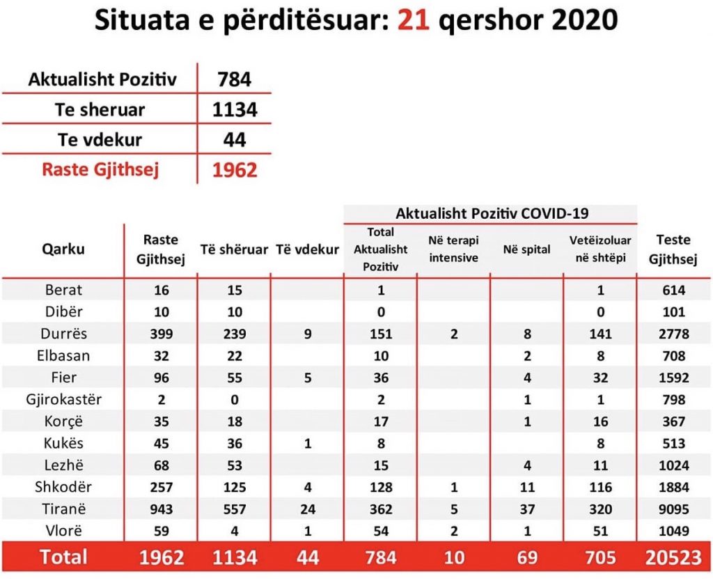 Në 24 orët e fundit janë shëruar 8 qytetarë, duke e çuar në 1134 numrin e të shëruarve që nga fillimi i epidemisë. Në vendin tonë janë aktualisht 784 persona aktivë me COVID19, kryesisht në Tiranë, Shkodër, Durrës.