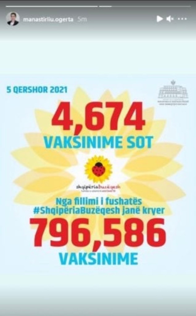 Ministrja e Shëndetësisë, Ogerta Manastirliu ka publikuar sot shifrat e fundit sa i takon procesit të vaksinimit në vend. Gjatë 24 orëve të fundit janë kryer 4674 doza vaksine, duke e çuar në 796.586 numrin total të vaksinave që nga fillimi i pandemisë. Nesër prekim shifrën e pplotë 800 mijë vaksinime.