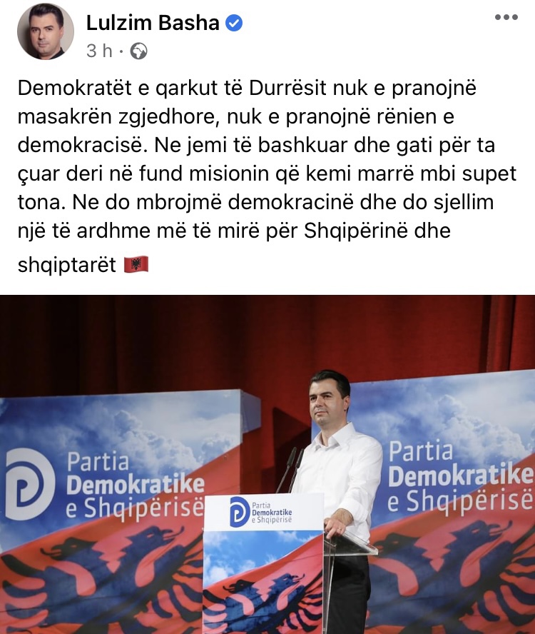 Kryetari i PD-së, Lulzim Basha, pas takimit që ka zhvilluar sot në Durrës në vazhdim të garës për kryetar të PD-së, ka reaguar në një postim në “Facebook” ku shkruan se demokratët e qarkut Durrës nuk e pranojnë masakrën zgjedhore dhe rënien e demokracisë.Basha shkruan se demokratët, të gjithë, janë të bashkuar dhe gati për ta çuar deri në fund misionin që kanë marrë mbi supet e tyre.Sipas tij, demokratët do ta mbrojnë demokracinë dhe do sjellin një të ardhme më të mirë për Shqipërinë dhe shqiptarët.