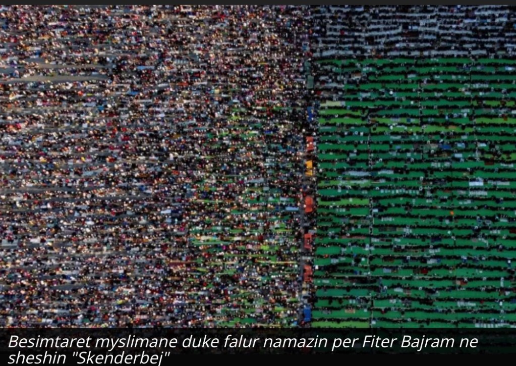 Sheshi “Skënderbej” i mbushur mëngjesin e sotëm plot me besimtarë myslimanë, të cilët falën namazin për festën e Fitër Bajramit ka tërhequr vëmendjen edhe të medias britanike, BBC. Në 12 fotot më të veçanta të kësaj feste të rëndësishëm për myslimanët qëndron edhe sheshi “Skënderbej” i tejmbushur nga besimtarët.