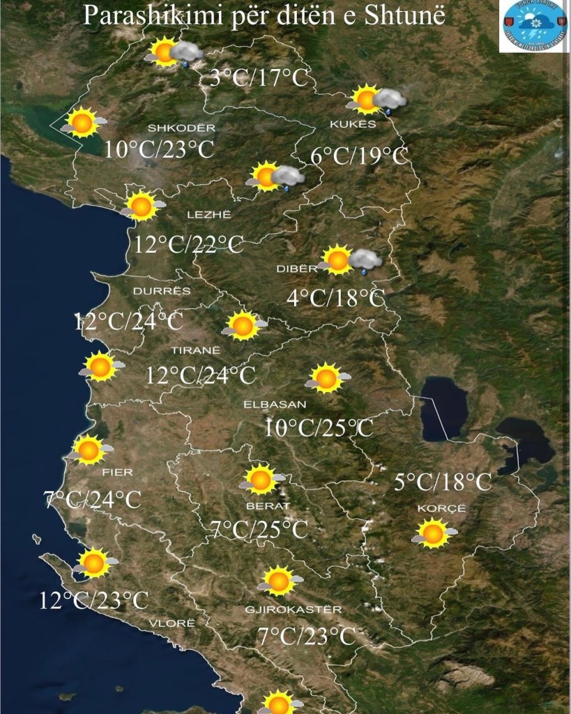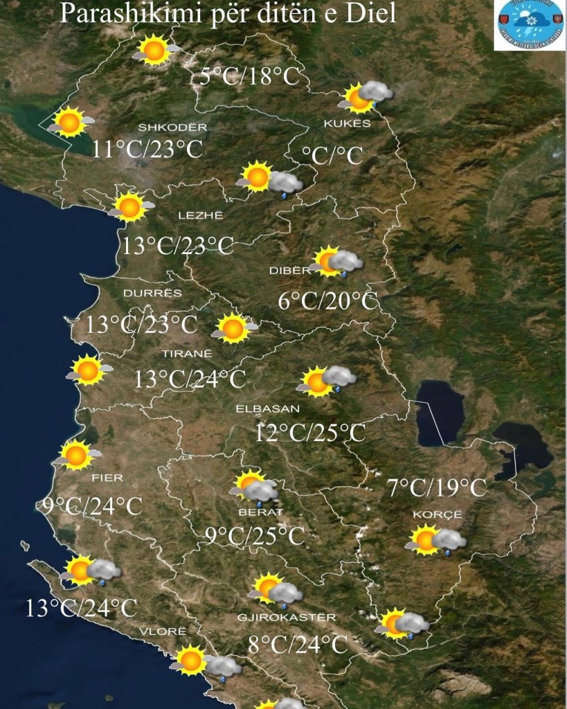 Dita e diel do të jetë në ndikim të kushteve atmosferike të paqëndrueshme. Moti parashikohet me vranësira dhe intervale kthjellimesh. Reshjet e shiut do të bëhen prezente fillimisht në jug në orët e para të mëngjesit e më pas përgjatë relieveve malore pasdite. Era do të fryjë me drejtim verilindje-veriperëndim me shpejtësi mesatare1-7m/s. Valëzimi në dete i ulët I forcës 1-2ballë.