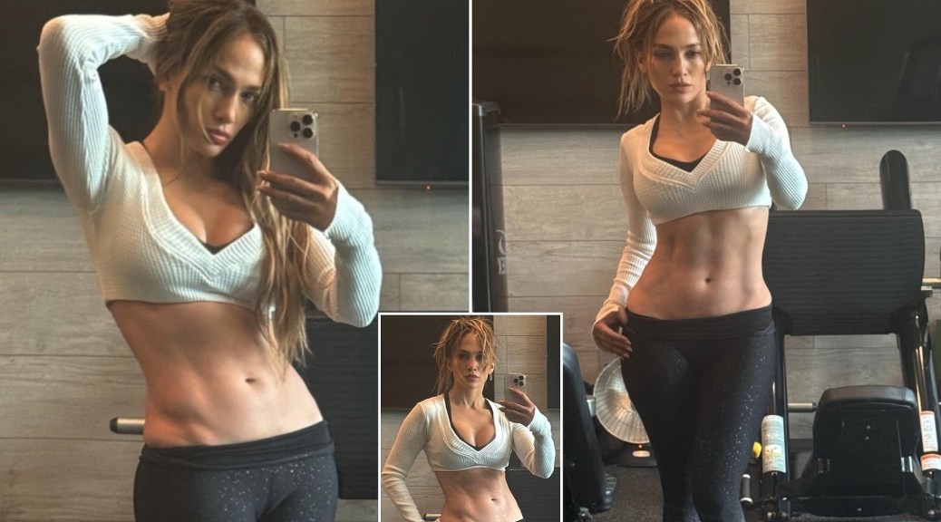 Jennifer Lopez was up early on Sunday working out in the gym, and she shared a slideshow of snaps of her impressively sculpted abs as proof. The 56-year-old Bronx-born pop diva flexed her etched six-pack while clad in a plunging white-ribbed cropped sweater over a black sports bra, matching low-rise leggings and white sneakers.